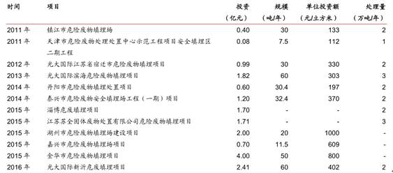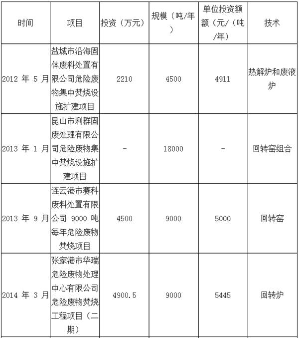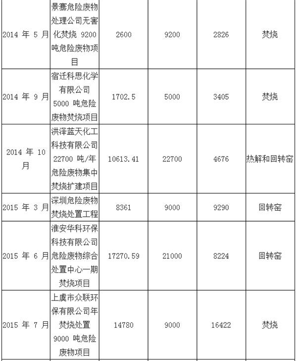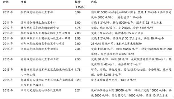 随着危废行业的管理加强,逐步规范,需要集中处理,而这就要求了危废项目具备综合处理处置的能力,包括焚烧、填埋、物化、稳定化等多种无害化处置设施和资源化的能力,危废综合处置项目会越来越多。统计近年的部分危险废物综合处置项目的情况,列于下表中, 可以看到: 1) 危废综合项目项目根据各地的实际需求和条件,选择处置方式的搭配, 单位投资的均值, 在 2000-5000 元/(吨/年)。 2) 项目需求是全国性的,东西部均有较大需求。3)总处理规模在 5 万吨/年以上的大型危废综合处置项目开始频繁出现。