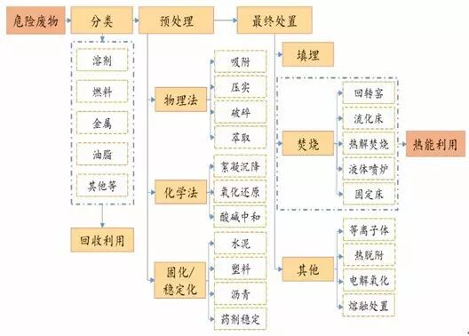 危险废物处理处置总的技术路线来说,大致分为分类、预处理、最终处置等几个核心环节,其中: