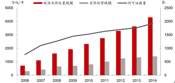 我国危废处理处置行业实行许可证制度,这也是危废行业最大的壁垒。大中城市的危废许可证不断发放,到 2014 年达 1921 份。2014 年,全国危废经营单位核准利用处置规模达到 4304 万吨/年,实际处理处置量仅为 1387 万吨/年,说明当前危废处理处置的实际利用率还很低,缺口大。缺口大的原因,一方面是很多危废没有纳入统计,没有处理;另一方面也存在大量不具有资质的单位对危险废物进行处理利用,存在处理不规范、不彻底、不安全等现象,带来环境隐患,造成直接污染或二次污染。